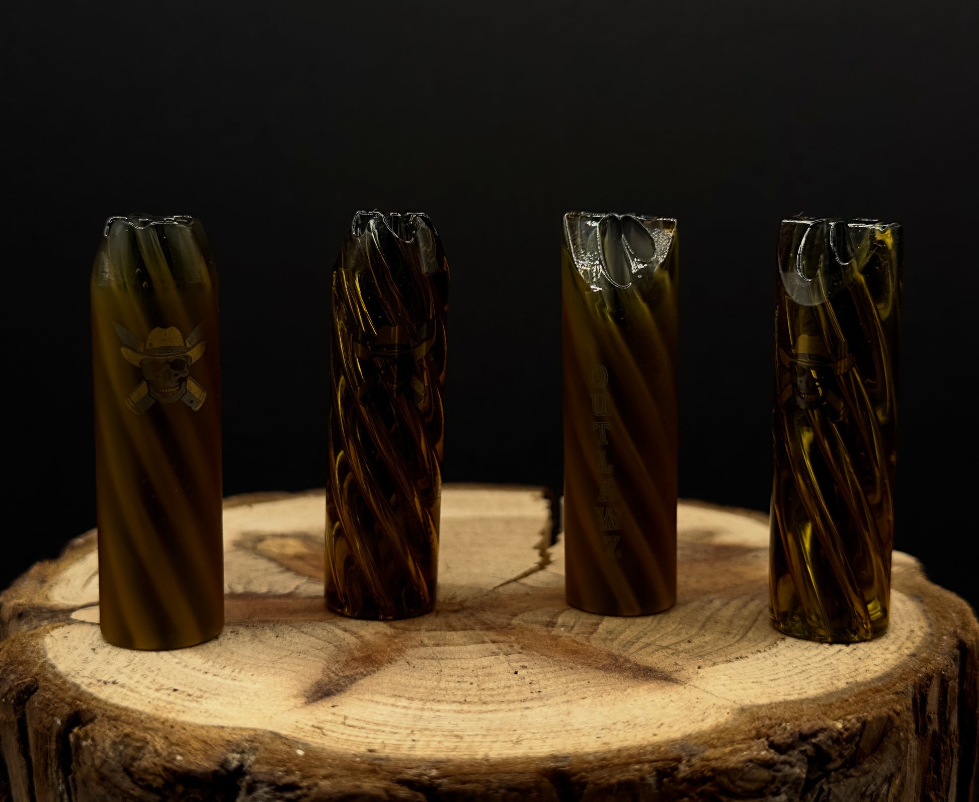 The second color way is our Goldeneye . This features an inner smoked gray with a transparent golden jacket on the exterior, when cut into bullet shape it looks like a real bullet. This year we are using a new 6 hole pattern that includes larger holes shaped more like teardrops than typical holes leading the way to larger tubes for dramatically more airflow than before . This allows you to pack your doinks as tight as possible all while still getting larger hits from jump, this tighter pack also allows your ash to become even whiter in comparison to a slightly looser pack. We are also debuting all of these new variations and sizes :